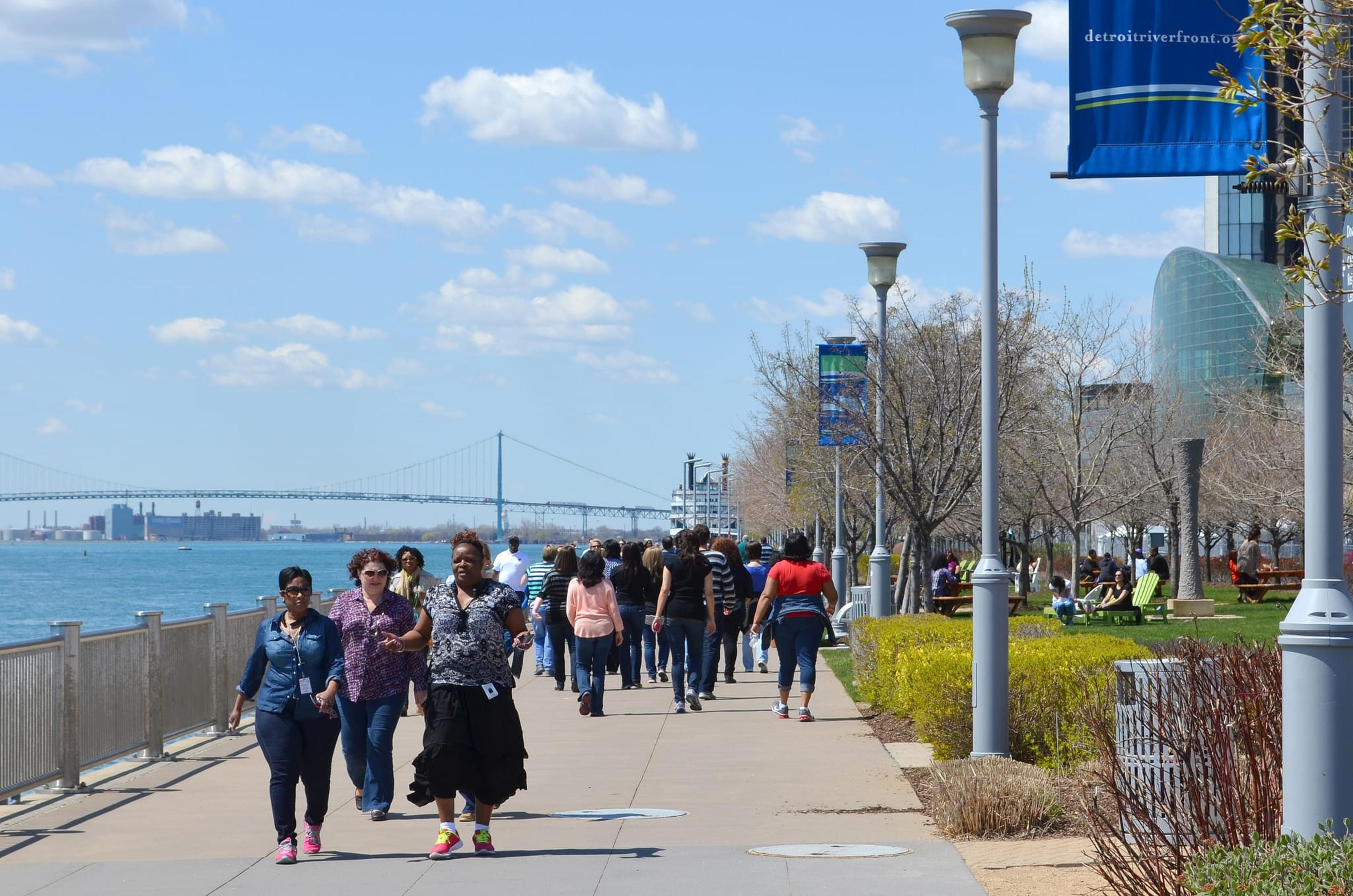 Blue Cross Blue Shield of Michigan and the Detroit RiverFront Conservancy will celebrate the launch of this summer’s “Live the Riverfront” program by hosting a stroll along the water’s edge during Blue Cross Blue Shield of Michigan’s “Walk@Lunch Day” on Friday, May 1. People from all over the state are encouraged to join hundreds of Blue Cross Blue Shield of Michigan employees and set time aside for a walk at some point during the day. In downtown Detroit, leaders from Blue Cross Blue Shield of Michigan and the Detroit RiverFront Conservancy will lead a noon waterfront walk from Rivard Plaza through Milliken State Park. The multi-year Live the Riverfront partnership between Blue Cross and the RiverFront Conservancy promotes physical fitness and healthy living initiatives through a series of free or low-cost activities along the riverfront. In 2014, the first year of the partnership, more than 3,000 individuals participated in Live the Riverfront programming. Highlights of Live the Riverfront this year include a weekly, Wednesday lunchtime walking program, a 5K/10k walk/run, weekly riverfront fitness classes and the debut of a new fit park along the riverfront. “Last year, the tremendous success of Live the Riverfront allowed us to introduce the riverfront to many new people,” said Mark Wallace, president and CEO of the Detroit RiverFront Conservancy. “We look forward to welcoming even more visitors this year and showing them that the Detroit riverfront is a vibrant and engaging destination for everyone to enjoy.” “Among all the great things happening downtown, this is among the most exciting. People are creating a culture of health and wellness in Detroit and we are proud to be part of that,” said Daniel J. Loepp, president and CEO, Blue Cross Blue Shield of Michigan. “Through our partnership with the Detroit RiverFront Conservancy, we are promoting one the city’s greatest assets and reaffirming our longstanding commitment to the city of Detroit.” Details of the Live the Riverfront initiative include: