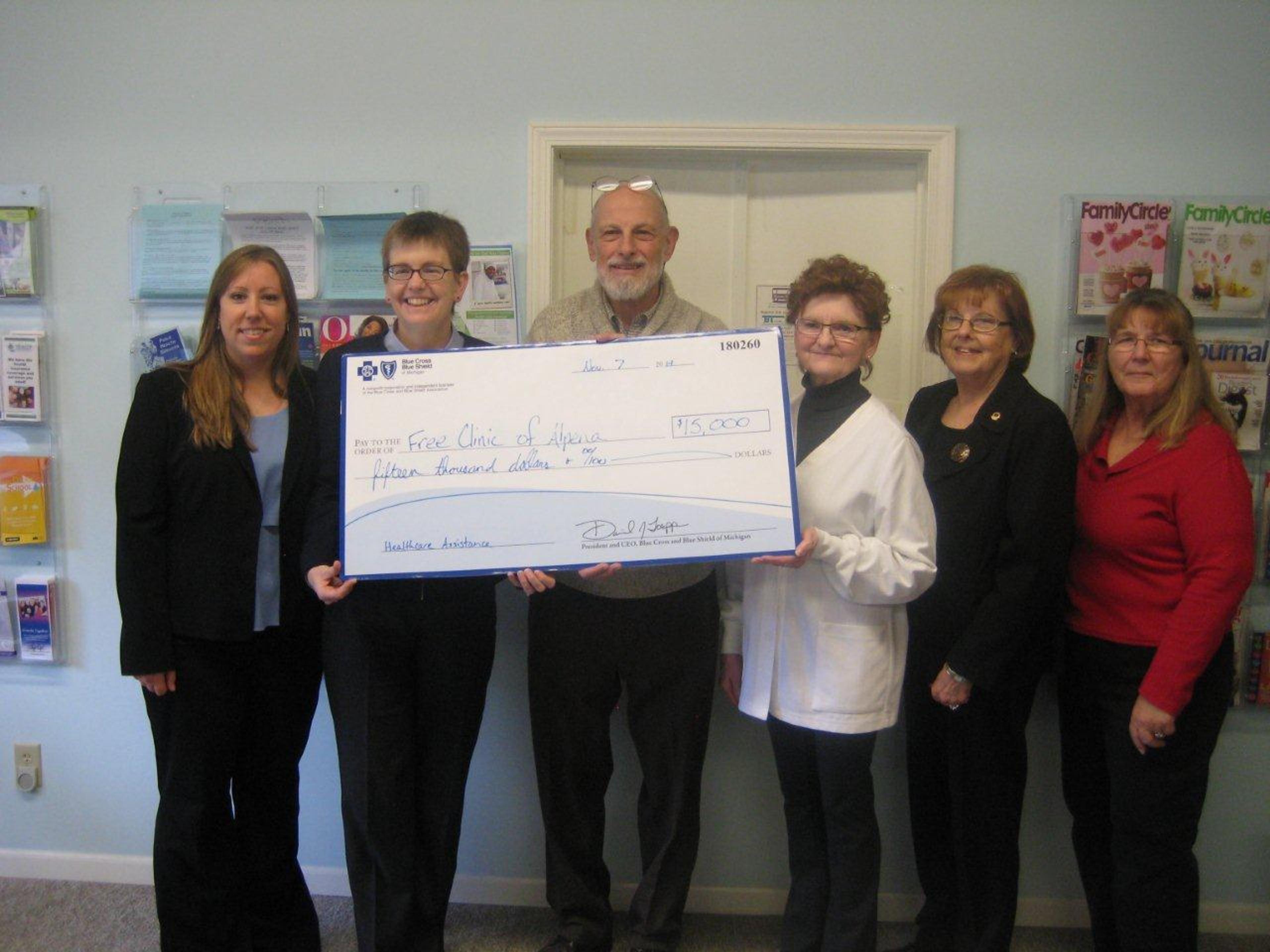 Blue Cross Blue Shield of Michigan presented the Free Clinic of Alpena with $15,000 in grant funding today to help underserved and uninsured people in the region gain access to health care services as part of Blue Cross’ Strengthening the Safety Net grant program. Last year, clinic volunteers handled more than 1,300 cases. The clinic also provided 72 patients with dental vouchers for service and treatment at partner Dental Clinics North. More than 15 percent of the Alpena County population has no health insurance. “Without these clinics, patients would delay and even forego medical treatment at great cost to themselves, their families and the health care system,” said Jeff Connolly, senior vice president of Large Group Business and president of West Michigan at Blue Cross Blue Shield of Michigan. “They are an extremely important part of Michigan’s safety net.” With the distribution of the 2014 Strengthening the Safety Net grants, Blue Cross has provided more than $10 million to support safety net providers across Michigan since the grant program was created in 2005. The grants have enabled clinics to care for more than 60,000 people annually and have accounted for more than 1 million patient medical visits. The 2014 grants can be applied to daily operations and enrollment assistance for the Healthy Michigan Plan. “On behalf of our patients and our all-volunteer staff at the Free Clinic of Alpena I want to express our gratitude to Blue Cross Blue Shield of Michigan for supporting free clinics like ours, helping thousands of uninsured people get treatment and care for a wide range of health care needs,” said Steven Hammond, PA-C, clinic director of the Free Clinic of Alpena. “Our volunteers see firsthand the need for care in the rural communities that we serve. We are seeing more demand even as our resources dwindle, so this grant from Blue Cross Blue Shield of Michigan is vital to building a healthy community here in northeast Michigan.” The Strengthening the Safety Net grant was presented at the Free Clinic of Alpena on Friday, Nov. 7. For more information on Blue Cross’ Strengthening the Safety Net program, visit bcbsm.com. Blue Cross Blue Shield of Michigan, a nonprofit mutual insurance company, is an independent licensee of the Blue Cross and Blue Shield Association. BCBSM provides and administers health benefits to more than 4.4 million members residing in Michigan in addition to employees of Michigan-headquartered companies who reside outside the state. For more company information, visit bcbsm.com and MiBluesPerspectives.com.