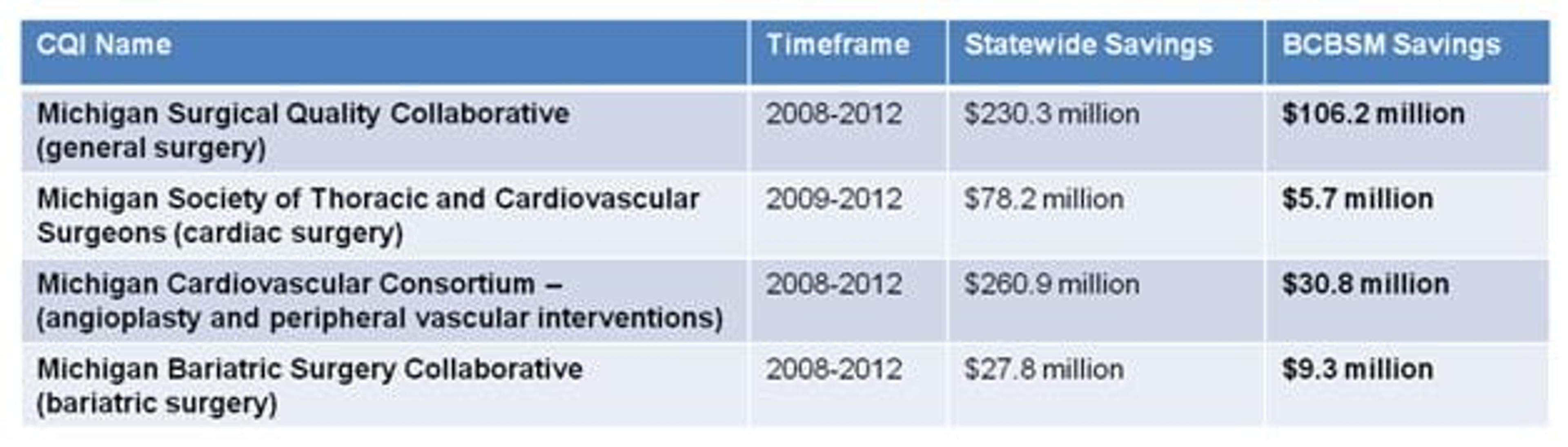 It’s no secret – we all know how high the cost of healthcare is in America. In 2012, U.S. health spending totaled $2.8 trillion – or $8,915 per person. That’s more than two months of an average American’s salary. In 1997, Blue Cross partnered with five Michigan hospitals to address rising costs with a single collaborative effort to improve angioplasty. Over 15 years later, the collaboration has grown to multiple programs – called Collaborative Quality Initiatives (CQIs) – that have saved hundreds of millions of dollars in Michigan. These partnerships between the Michigan Blues and hospitals across the state address some of the most common and costly areas of surgical and medical care. Hospitals collect, share and analyze data, then design and implement changes to improve patient outcomes and decrease unnecessary health care costs. Over a five-year period, five CQIs aimed at improving the quality of specific medical and surgical procedures performed in Michigan hospitals have produced $597 million in health care cost savings, while lowering complication and mortality rates for thousands of patients. The results of these five Collaborative Quality Initiatives – covering general surgery, bariatric surgery, angioplasty, vascular conditions and cardiac surgery – were achieved through widespread collaboration with 75 Michigan hospitals. Cost savings for the five programs studied break down as follows: