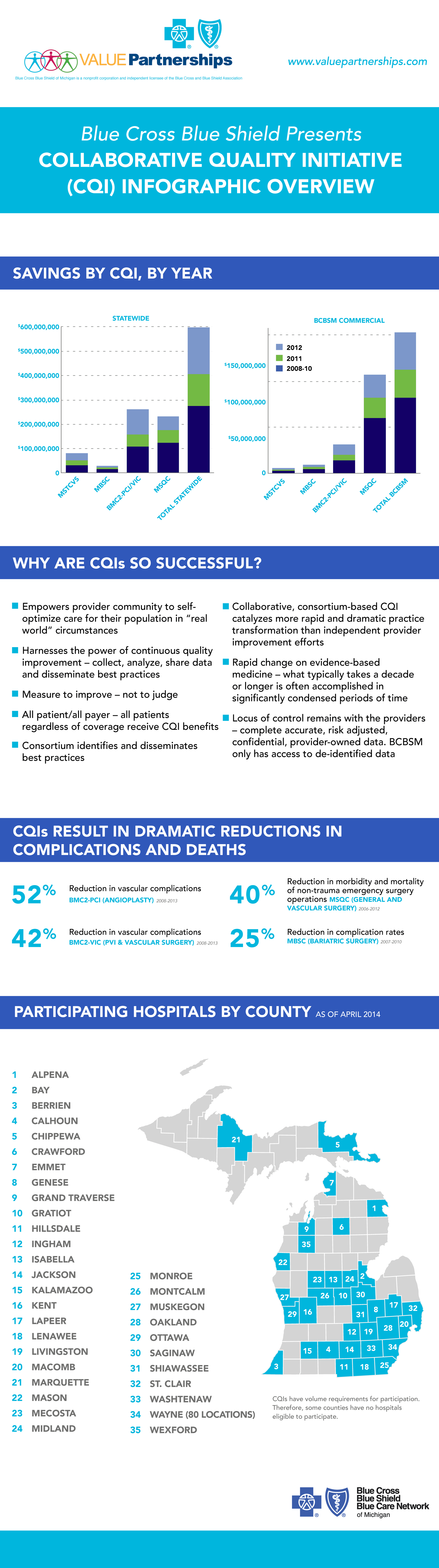 “While the dollar savings are important, it’s crucial to see the meaning behind the money. These CQIs are saving and improving lives. The cost savings come because people are coming home from the hospital sooner, and healing without complications so they can return to work on time,” said David Share, MD, MPH, BCBSM senior vice president of Value Partnerships. “Michigan is a safer place for health care because these CQIs are so effective.” For more information on Collaborative Quality Initiatives, visit valuepartnerships.com.