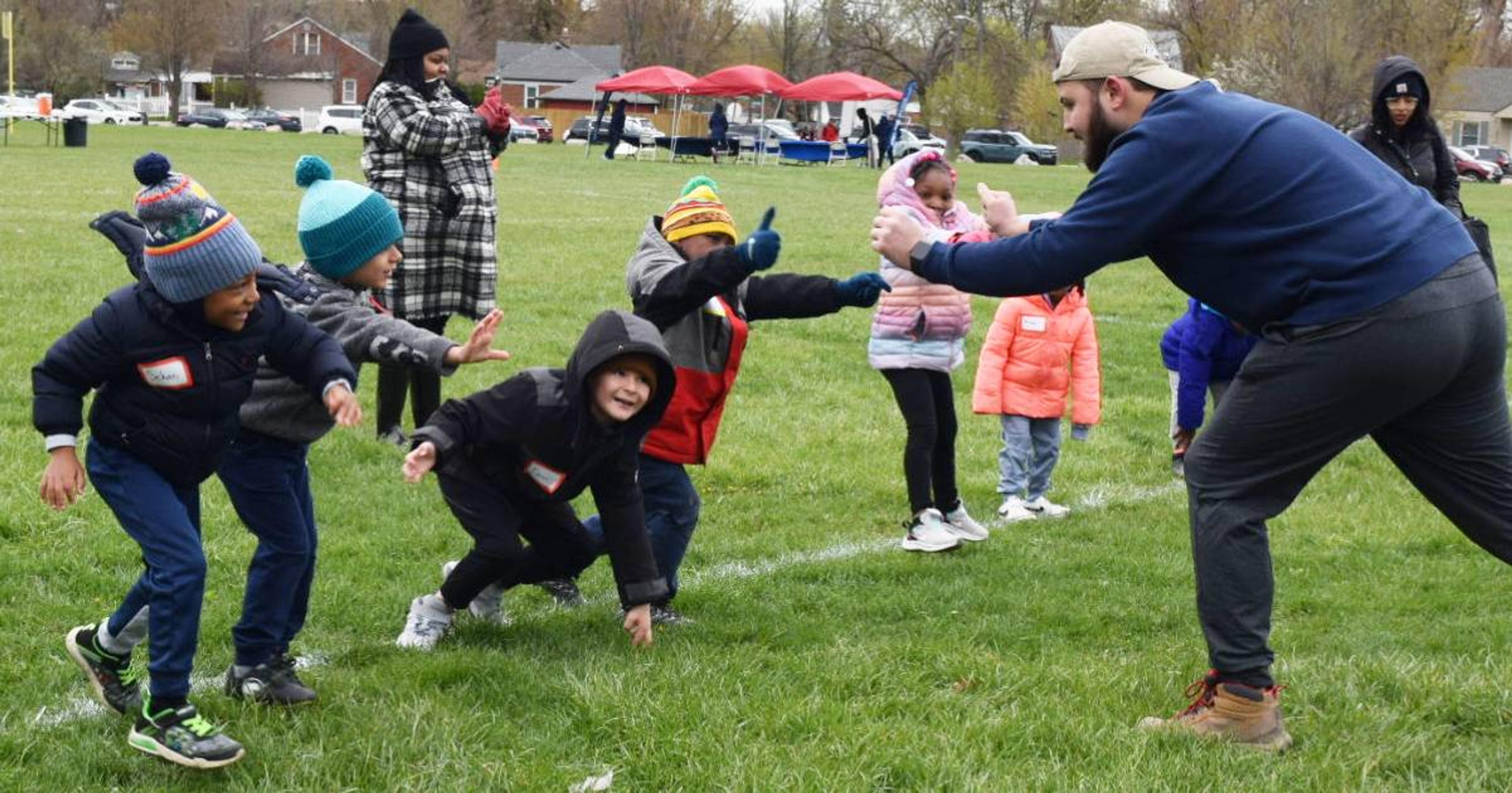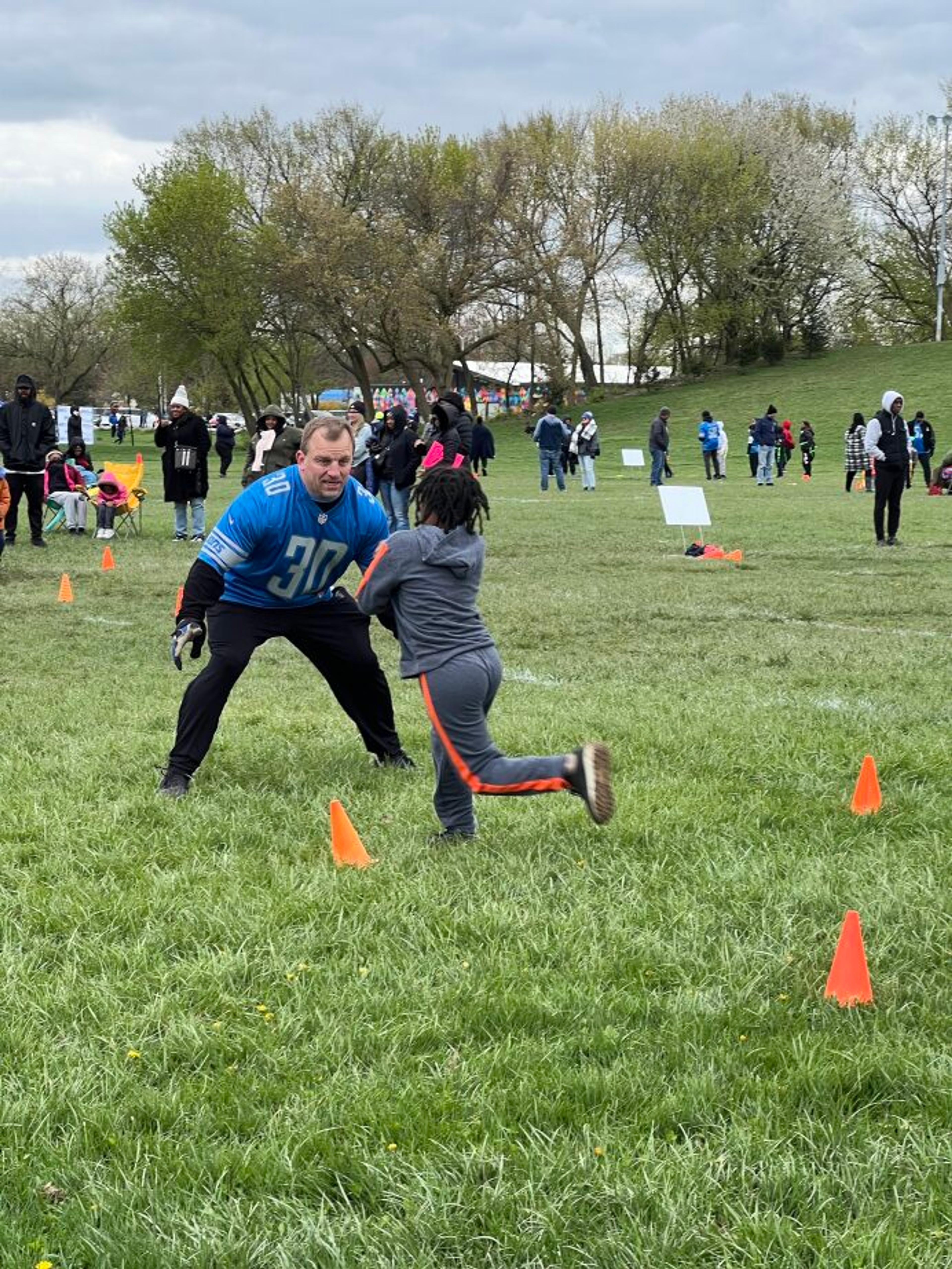 Whistle blows, airhorn signals and yards upon yards of laughter and frenzied excitement served as Saturday’s soundtrack. The chilly, 40-degree football weather cultivated more of a mid-November vibe than a mid-April one. Dozens of drill stations canvassed the spacious Balduck Park fields, the same fields BCBSM President and Chief Executive Officer Daniel J. Loepp sledded through as a child. At each station, kids learned basic football drills in a relaxed environment from Eagle Sports Club coaches and Detroit legends like Corey Schlesinger and Lomas Brown.