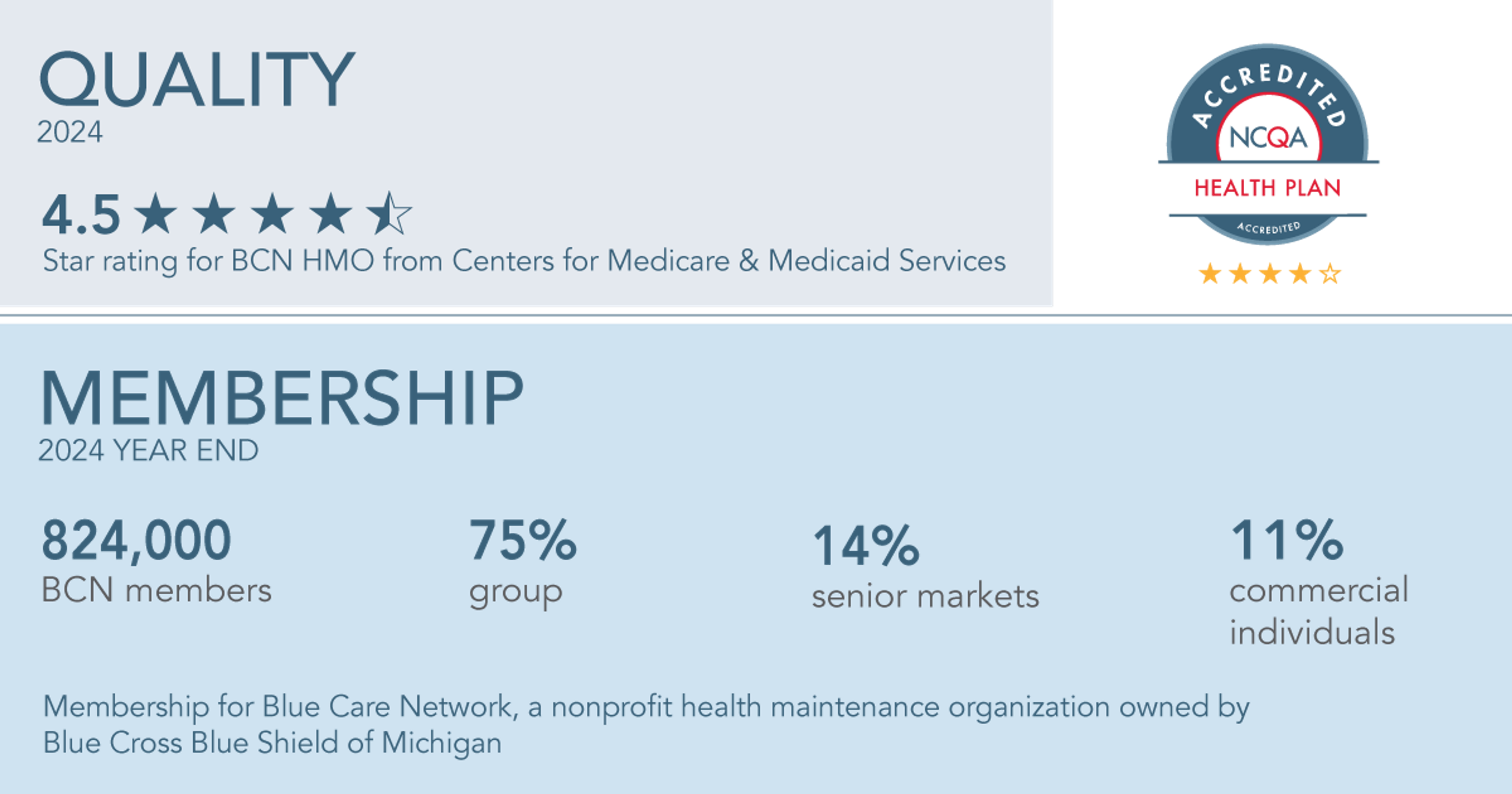 Blue Care Network is a nonprofit health maintenance organization owned by Blue Cross Blue Shield of Michigan. In 2024, BCN served nearly 824,000 members with access to care across all 83 counties in Michigan. Our annual report reveals how BCN contributes to our enterprise-wide endeavors to transform our operations and accelerate innovative solutions to make a healthier future for our members and customers.